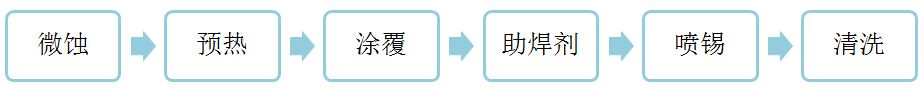 熱風整平又名熱風焊料整平,它是在PCB表面涂覆熔融錫鉛焊料并用加熱壓縮空氣整平(吹平)的工藝,使其形成一層既抗銅氧化又可提供良好的可焊性的涂覆層。熱風整平時焊料和銅在結合處形成銅錫金屬化合物,其厚度大約有1mil至2mil。PCB進行熱風整平時要浸在熔融的焊料中,風刀在焊料凝固之前吹平液態焊料,并能夠將銅面上焊料的彎月狀小化和阻止焊料橋接。熱風整平分為垂直式和水平式兩種,一般認為水平式較好,主要是水平式熱風整平鍍層比較均勻,可實現自動化生產。其生產的一般流程如下圖所示: