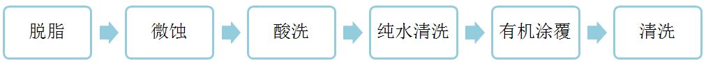 有機涂覆工藝簡單,成本低廉,使得其在業界被廣泛使用。早期的有機涂覆分子是起防銹作用的咪唑和苯并三唑,較新的分子主要是苯并咪唑。為了保證可以進行多次回流焊,銅面上只有一層的有機涂覆層是不行的,有很多層,這就是為什么化學槽中通常需要添加銅液。在涂覆第一層之后,涂覆層吸附銅;接著第二層的有機涂覆分子與銅結合,直至二十甚至上百次的有機涂覆分子集結在銅面。有機涂覆的生產流程如下圖所示: