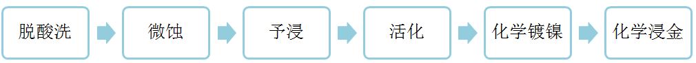 鍍鎳的原因是由于金和銅之間會相互擴散,而鎳層可以阻止這種擴散。如果沒有鎳層的阻隔,金將會在數小時內擴散到銅中去?;瘜W鍍鎳/浸金的另一個好處是鎳的強度,僅僅5um厚度的鎳就可以控制高溫下Z方向的膨脹。此外化學鍍鎳/浸金也可以阻止銅的溶解,這將有益于無鉛焊接?;瘜W鍍鎳/浸金的生產流程如下圖所示: