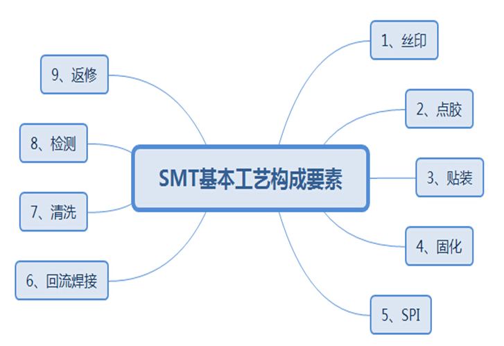 SMT是一個較復雜的電子加工過程,其工藝過程主要包括;絲印(或點膠)、貼裝(固化)、SPI(Solder Paste Inspection)、回流焊接、清洗、檢測、返修。